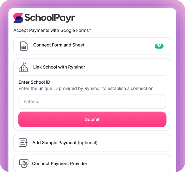 Once you’re happy with your Google Form™, simply toggle on “Connect Form and Sheet.” SchoolPayr will automatically make your form payable for parents and link it to a Google Sheet where you can track all responses and payment details. In addition, you’ll be able to instantly see all these details and more inside your rymindr account — so you can easily see who has paid. We automatically sync the payment details with your Google Sheets™ and Rymindr account so you know who has paid.
